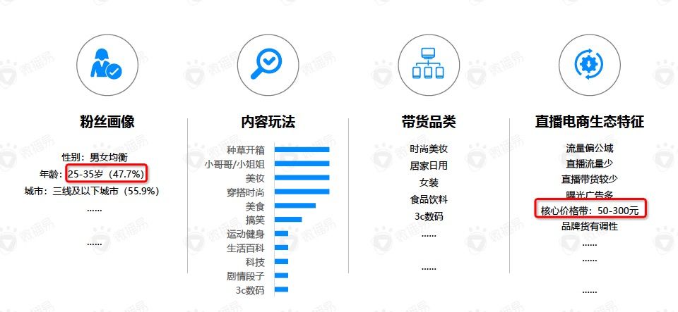 快手以低价商品为主,主要适合销售百元以内的食品、日杂、美妆、服饰等品类,出货量大,是其绝对的优势。直播以私域流量为主导。