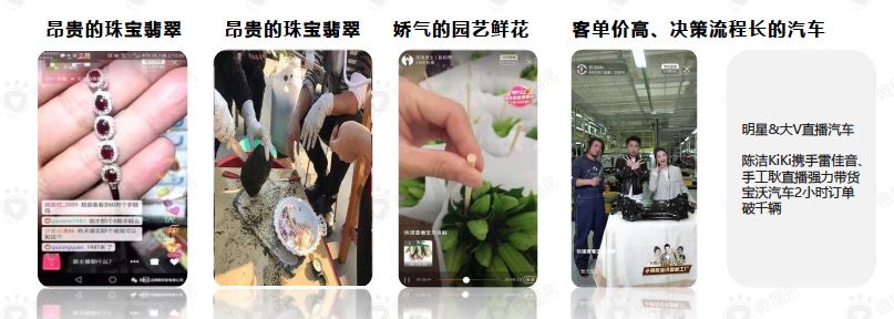 除此之外,对于专业需求较强的商品品类,如珠宝、汽车、3C、园艺等高单价、低复购的非标品类,也在直播带货中逐步渗透。