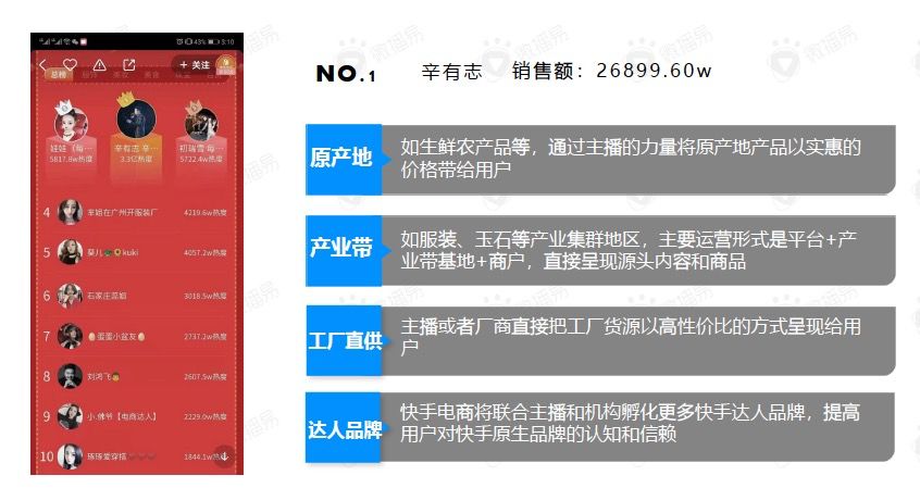 其中农副产品、白板产品、创业品牌产品更容易通过粉丝对主播的信任,实现人带货的电商模式。网红产品及乡镇产品,将得到平台和用户更大力度的支持。