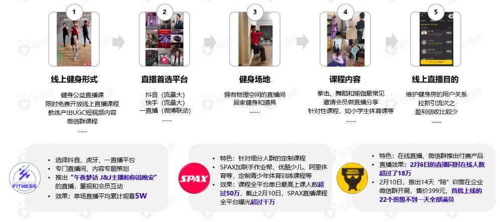 正在收入的黄金月遭受狙击,多家健身品牌快速开展线上作业模式,通过用户闲暇时长运动、“宅”在家健身等话题造势,打造居家健身内容的公开课汇聚流量,最终售卖专业课程回血,持续留存客户,转“危”为“机”。