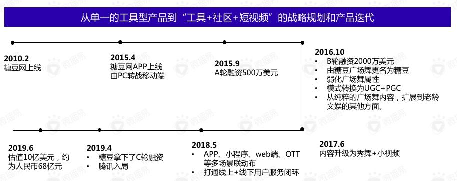 经历了从PC端到移动端、从纯广场舞到老龄娱乐内容扩容,在数字化底层技术扎实的阶段,开放小程序端口,在短视频的爆发中自我爆发。截止2019年6月,估值已到10亿美元,全面领跑中老年社交应用。