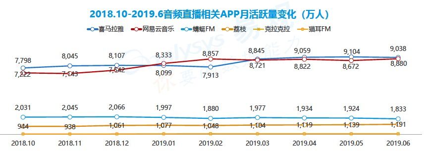 搭载音频直播功能的代表型APP,如网易云、喜马拉雅、荔枝,在用户规模上基本能够保持稳定。