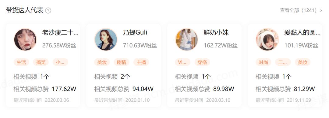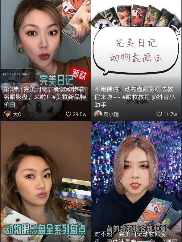 除此之外,在抖音平台,完美日记的卖货目的相对较强。据抖参谋近30天的数据统计,仅为动物眼影盘单个官方淘宝链接导流带货的达人就达1200+,这些自媒体以美妆”“种草”“时尚”“vlog”“穿搭”内容为主,帮助完美日记进行带货效果转化。