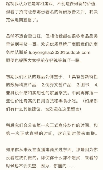 3、作为直播界的“新鲜血液”,除了选品、供应链、团队等问题,中年的老罗可能还将面临其他年轻主播没有的挑战。偶像包袱和理想主义包袱特别重的罗老师能不能真的在直播间里放下来?有没有年轻人体力?能不能坚持下来?坐等罗老师开播!