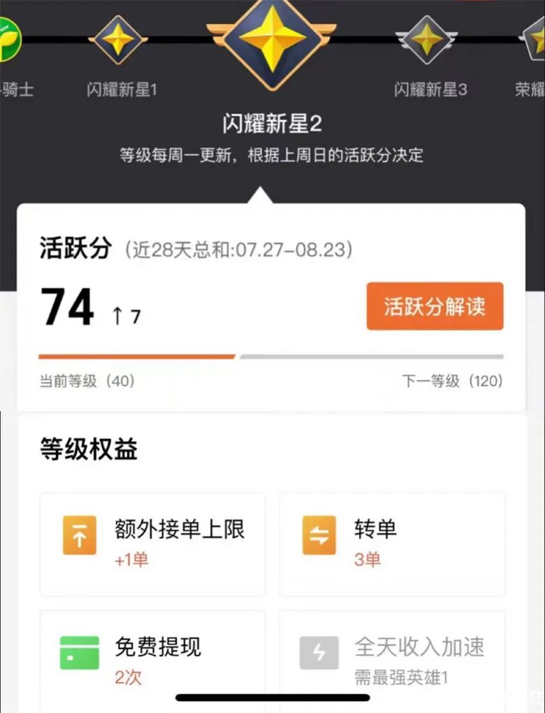 而骑手等级是依靠平台上每周的活跃分来划分,等级越高,一次能接到的单数就更高,不然就只能一次接5单,活跃分每周日会更新一次,如果长时间没有上线跑单的话,活跃分就会下降,等级也会往下降,之前在4级的江哥因为上个月跑的少已经降到了2级,一次只能接6单。
