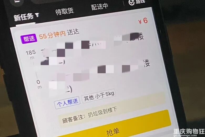 江哥刷单时看到一个佣金6元,始发地和目的地都一样的订单,他赶紧拿给我看,说这个是顾客自己下的单,是帮扔垃圾,就在刚刚送餐的那个小区。