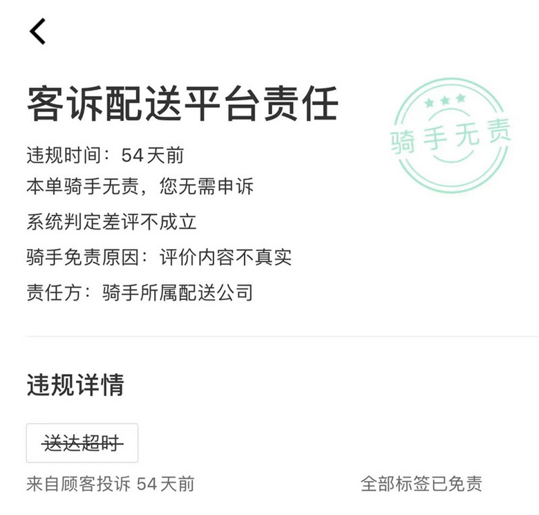 提起超时,还有一个不得不提的情况,客户在平台上看到的超时时间和外卖小哥的时间也有可能不一致。江哥告诉我说他之前就遇到过客户投诉送达超时,单平台核实之后就撤销了,因为顾客下单后平台是默认40分钟送达,但遇到订单长时间没人接,外卖小哥接单后显示的时间肯定和顾客的时间不一样,所以平台就会按照实际接单时间判定是否有超时。