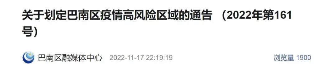 重庆市巴南区新型冠状病毒肺炎疫情防控指挥部发布关于划定巴南区疫情高风险区域的通告(2022年第161号)。