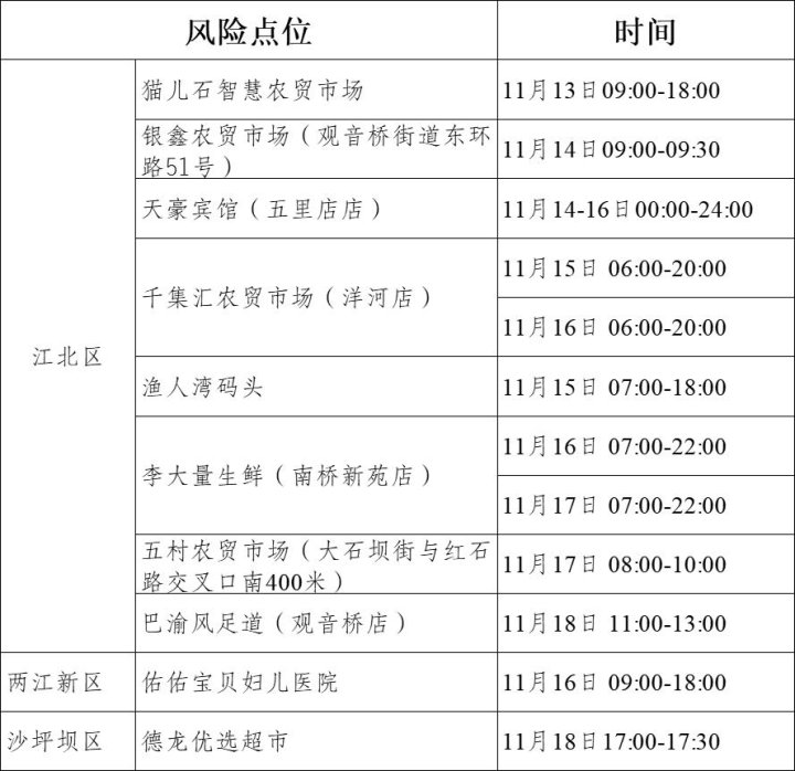 其中,确诊病例1-5和无症状感染者1-867在管控中发现,均无社会面活动轨迹。现将确诊病例6-8和无症状感染者868-1036在渝主要活动轨迹的风险点位和时间通告如下: