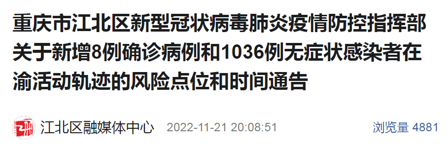 重庆市江北区新型冠状病毒肺炎疫情防控指挥部发布关于新增8例确诊病例和1036例无症状感染者在渝活动轨迹的风险点位和时间通告(2022年第84号)。