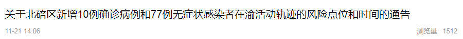 重庆市北碚区新型冠状病毒肺炎疫情防控指挥部发布关于北碚区新增10例确诊病例和77例无症状感染者在渝活动轨迹的风险点位和时间的通告。