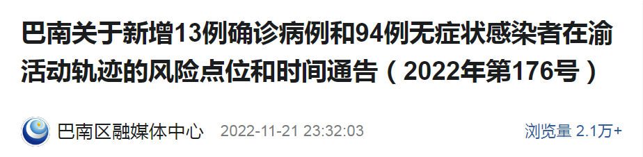 重庆市巴南区新型冠状病毒肺炎疫情防控指挥部关于新增13例确诊病例和94例无症状感染者在渝活动轨迹的风险点位和时间通告(2022年第176号)。