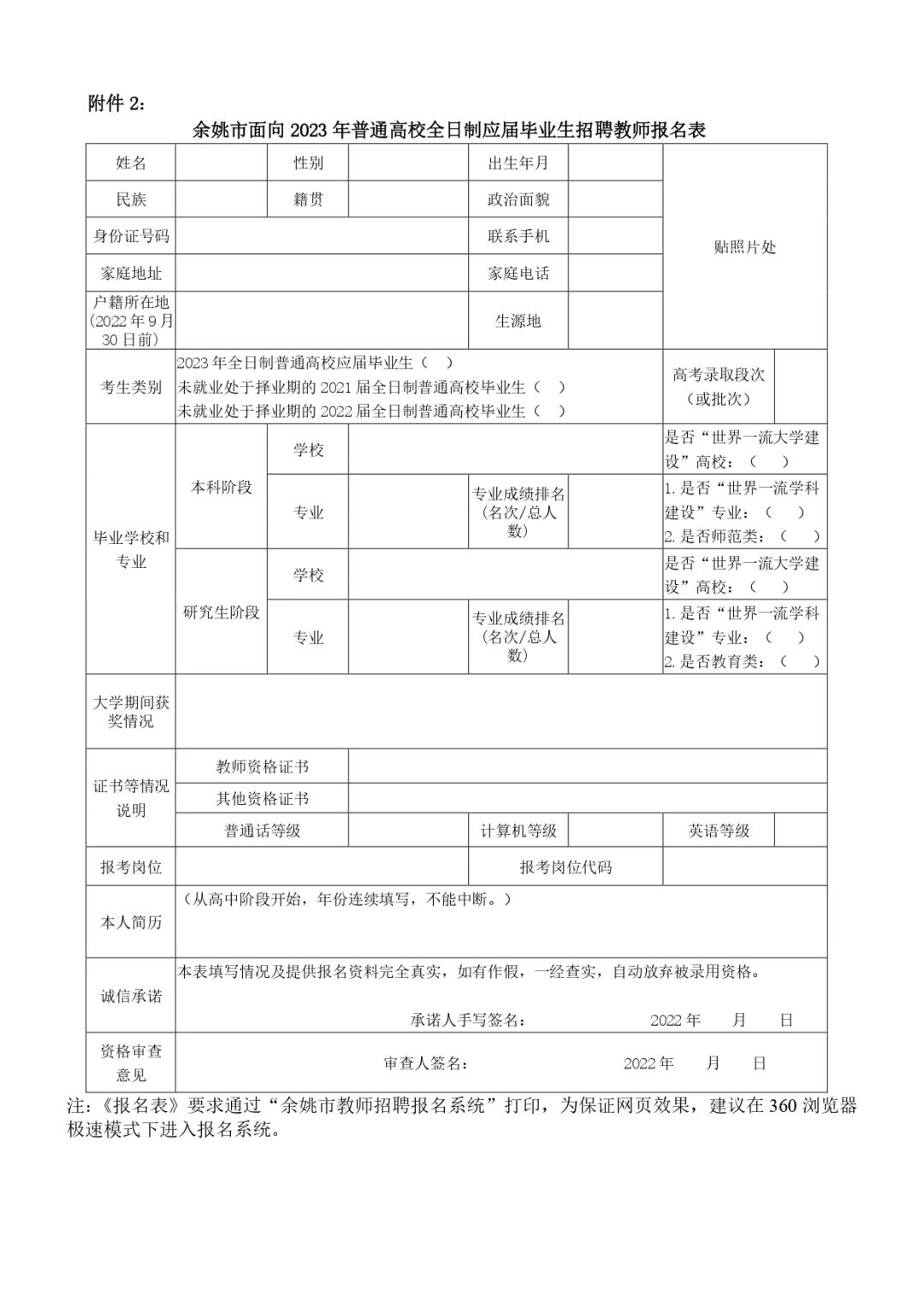 附件2:《余姚市面向2023年普通高校全日制应届毕业生招聘教师报名表》