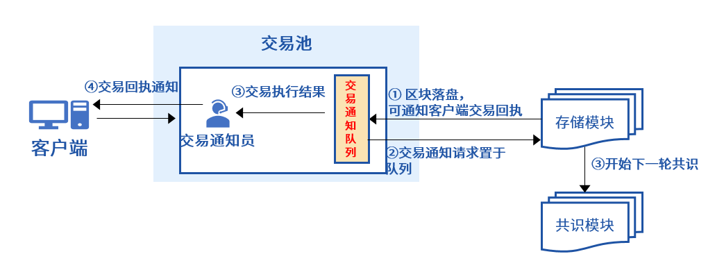 交易通知:交易上链成功后,交易池的上链通知员将交易执行结果通知给客户端。