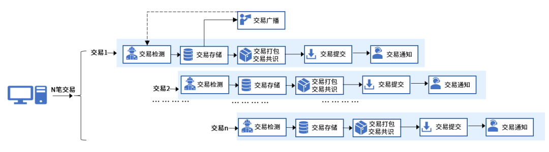 交易检测:客户端发送的交易发送到节点后,首先要经过交易池的质量检测员的检验,交易池仅会把签名有效、不重复、未上链的交易放入交易池内。