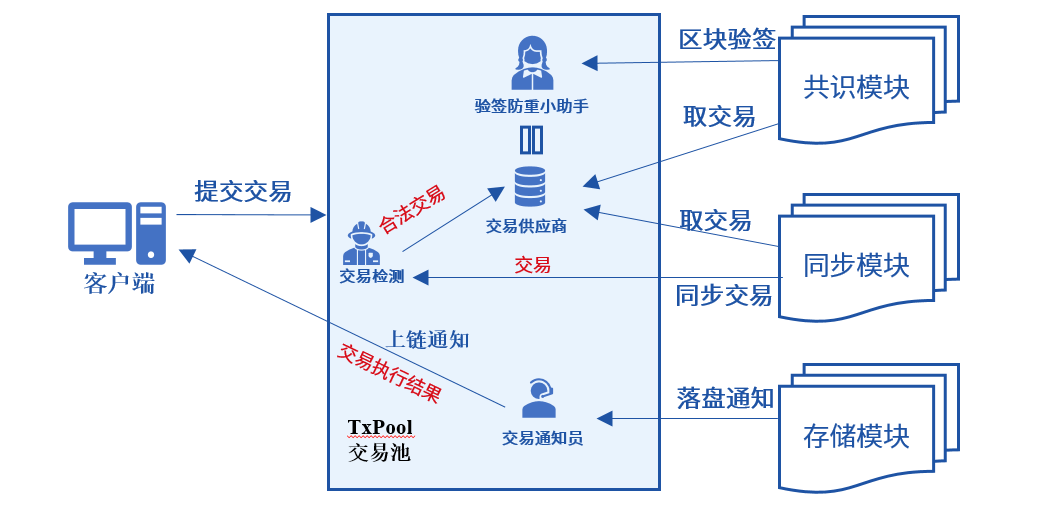 交易池作为区块链核心模块,身兼四职,每笔交易处理流程中,均需与后端三个模块、内部四个模块以及客户端进行多达八次交互,确实是异常忙碌。