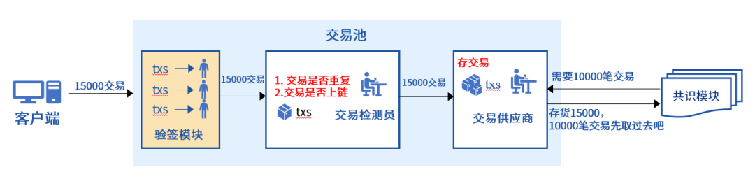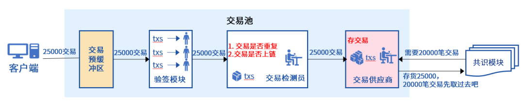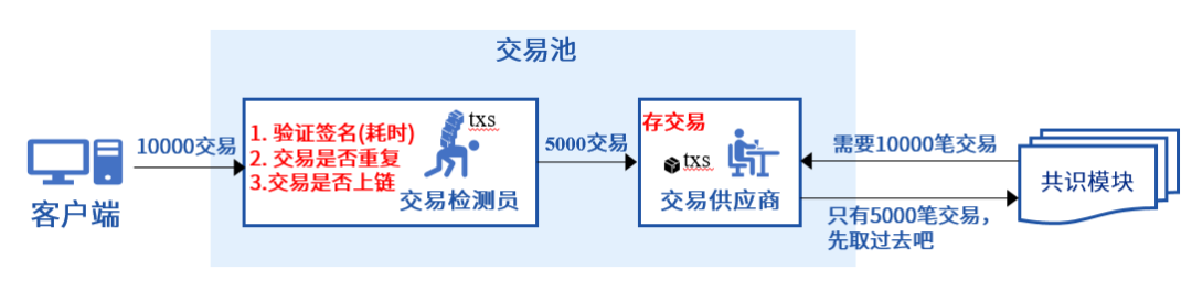 排查发现,交易池作为交易检测员任务太重,既要验证交易签名,又要检查交易是否重复、是否已上链,导致向交易供应商提供交易效率非常低,经常出现交易供不应求的情况,严重影响了区块链系统TPS。