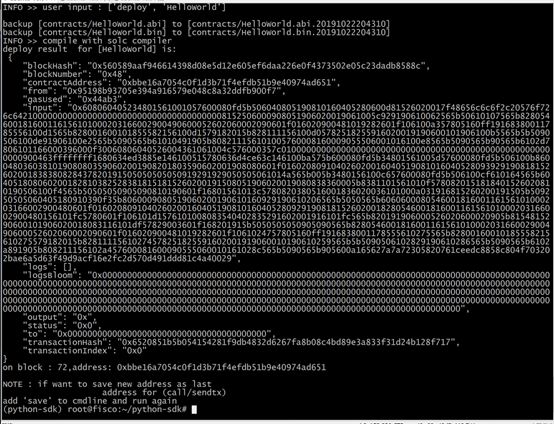 下图是HelloWorld合约部署输出,从中可看出,合约地址为: