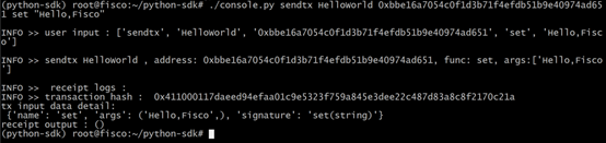 使用./console.py sendtx HelloWorld 0xbbe16a7054c0f1d3b71f4efdb51b9e40974ad651 set "Hello,Fisco"命令可将HelloWorld合约的name成员变量设置为"Hello, Fisco",输入如下: