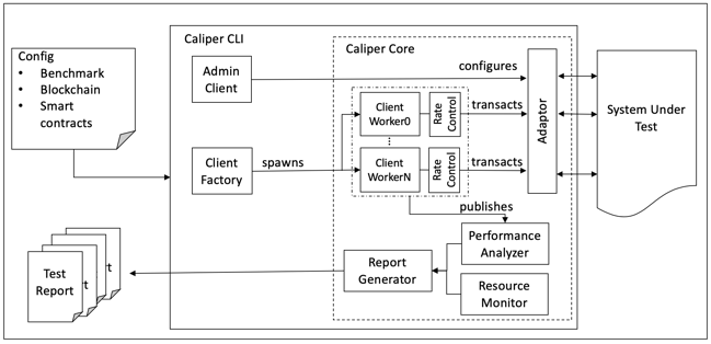 Caliper的架构图如上图所示。在Caliper中,Caliper CLI负责为内部的Caliper Core(接口及核心层)提供方便易用的命令行工具。接口及核心层包含区块链适配接口、资源监控模块、性能分析模块及报告生成模块。