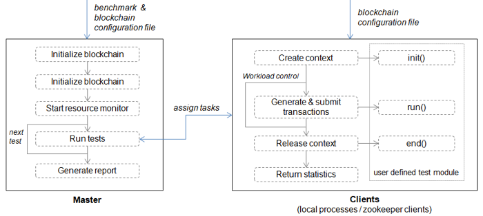 准备阶段:在此阶段,Master进程使用区块链配置文件创建并初始化内部区块链对象,按照配置中指定的参数部署智能合约,并启动监控对象以监控后端区块链系统的资源消耗;