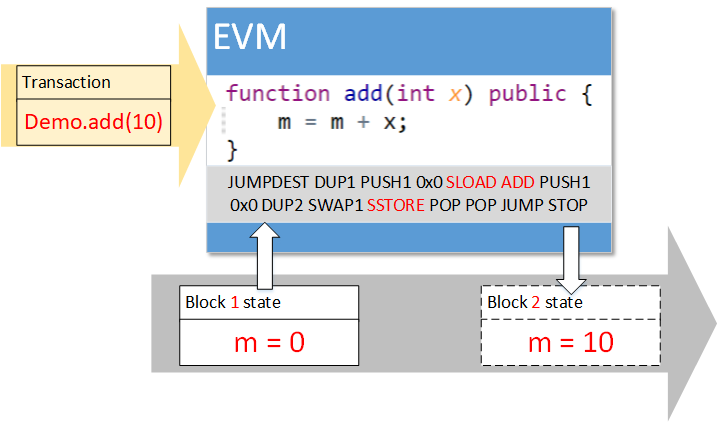 EVM执行合约代码,从区块链上读入当前区块的数据,进行相加操作,并将结果写入下一个区块(等待共识的区块)对应的状态数据中。