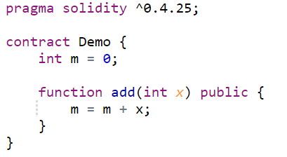 以此处的Demo合约为例,合约中有一个全局变量m,并有一个函数add(),实现给全局变量m增加x数值的功能。