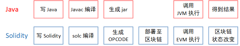 Solidity与Java类似。代码写好后,都需要通过编译器将代码转换成二进制,在Java中,编译器是Javac,而对于Solidity,是solc。生成后的二进制代码,会放到虚拟机里执行。Java代码在Java虚拟机(JVM)中执行,在Solidity中,是一个区块链上的虚拟机EVM。