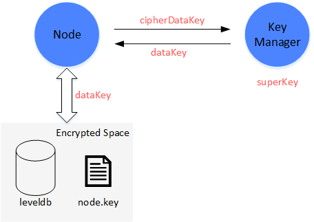 具体的实现过程,是通过节点自身持有的秘钥(dataKey)和Key Manager管理的全局秘钥(superKey)来完成的。