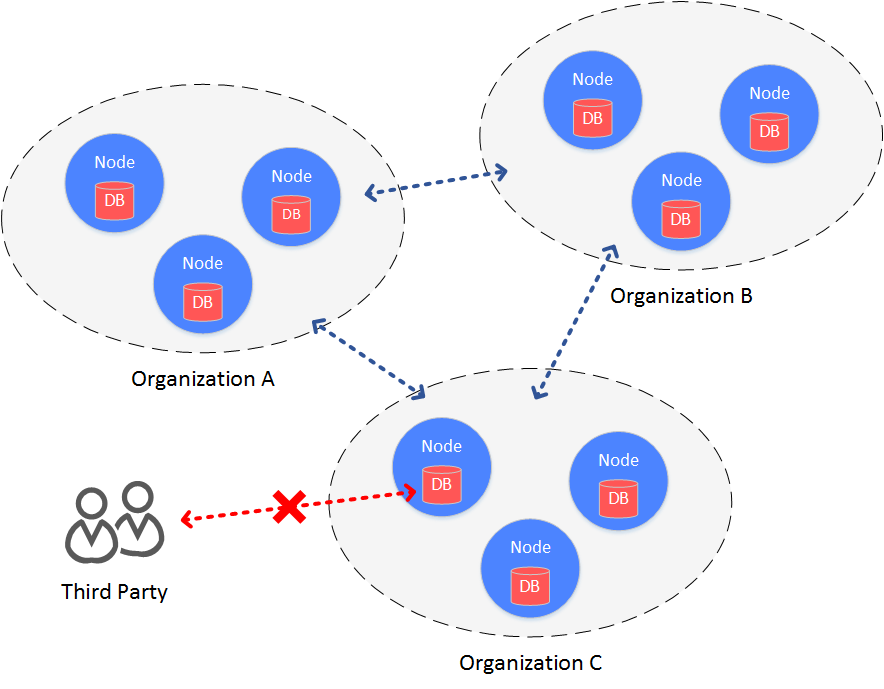 在联盟链的架构中,机构和机构之间搭建一条区块链,数据在联盟链的各个机构内是可见的。