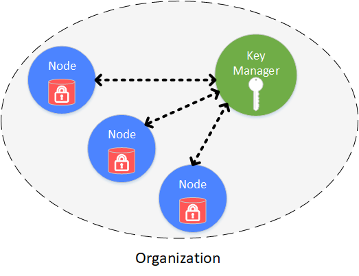 落盘加密是在机构内部进行的,每个机构独立管理自己硬盘数据的安全。内网中,每个节点的硬盘数据是被加密的。所有加密数据的访问权限,通过Key Manager来管理。