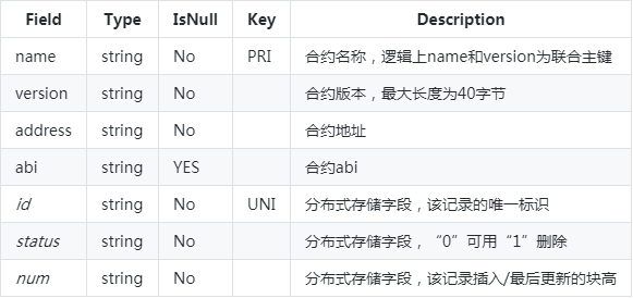 上述CNS信息以系统表的方式进行存储,账本内各节点一致,但各账本独立。CNS表定义如下:
