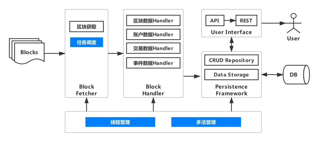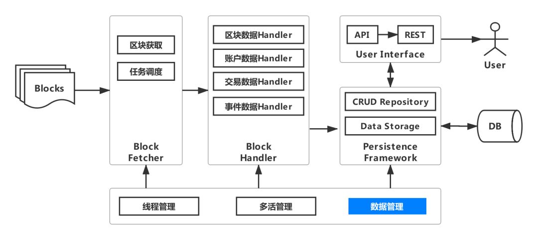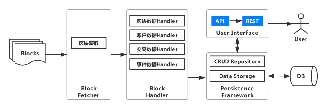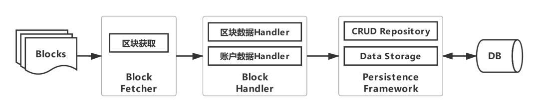 要想获取交易数据和event数据,必须针对区块链上的每一笔交易和event,根据智能合约进行解析,核心模块至少包括:交易/event和数据解析、数据库访问接口、POJO、SQL几个模块。