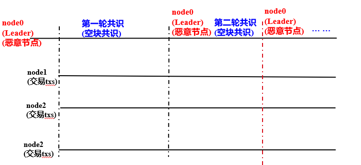 如上图,node0是不可信的当前Leader,若共识空块后不切换Leader,该节点一直向其他节点广播空块,使得Leader一直是node0,导致系统无法处理正常交易。