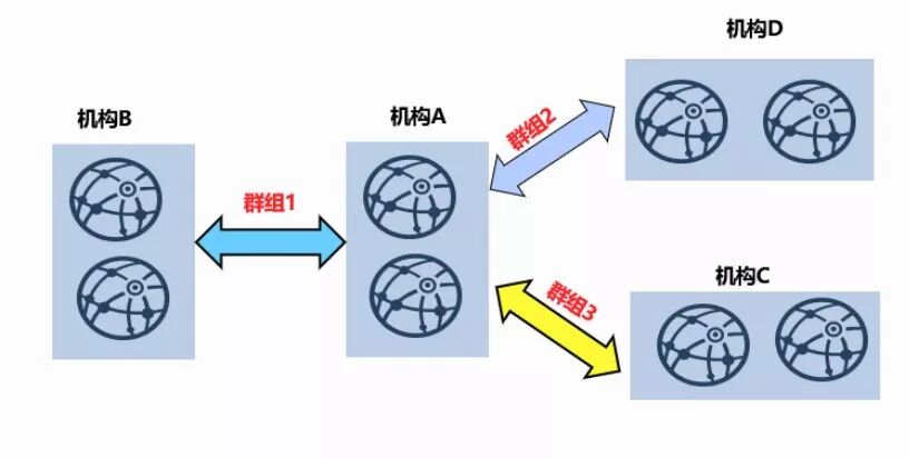 多群组架构中,每个节点会属于不同群组中。不同机构通过协商证书的形式,可以生成相应群组的创世区块,将其导入节点后,完成新群组的建立。
