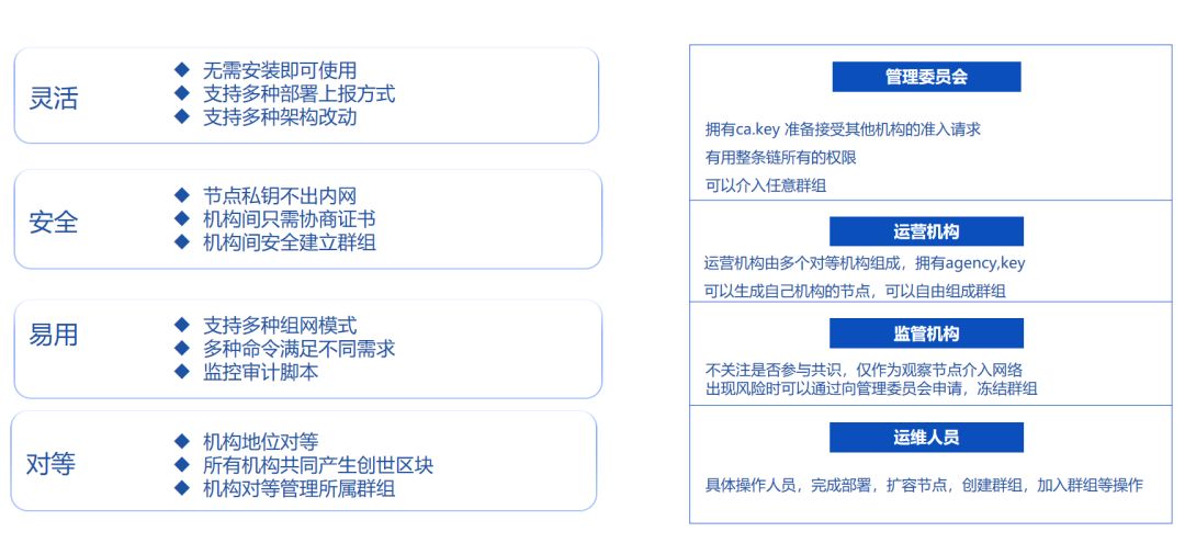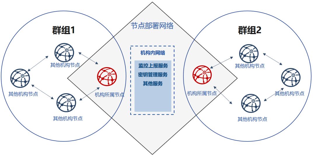因此,从对等、安全、高效的角度出发,部署过程需要联盟链委员会、机构内运维人员需要对证书、节点连接信息、群组创世区块等进行交互。