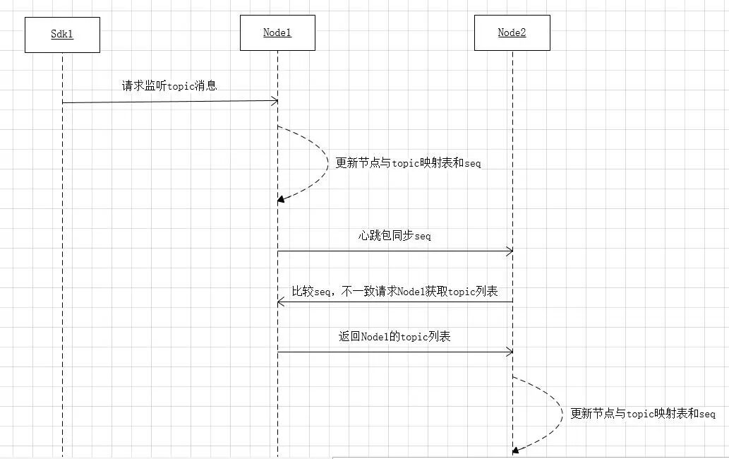 SDK1发送监听某个Topic消息的请求,到其直连的节点Node1,Node1里维护了节点与Topic列表的映射关系,该映射关系用于消息路由,是一个map结构,key是NodeId,value是一个set,set存储的是该NodeId可以接收消息的Topic列表。