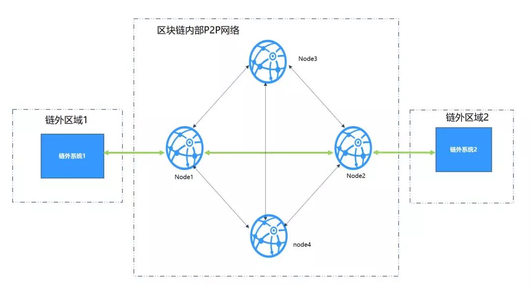 链外区域:机构内部的业务服务区,此区域内的业务子系统使用区块链SDK,连接到区块链节点。