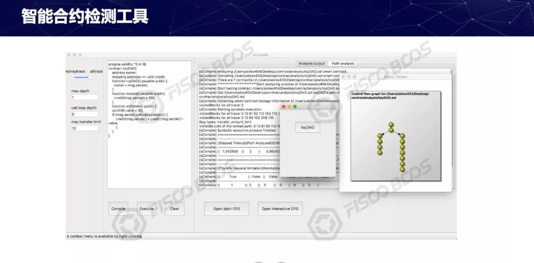 解决交易的安全问题,第一是研发相关的安全评测工具进行智能合约安全检测,第二是除了智能合约之外,我们还应该看到底层的一些这样的基础设施平台,如虚拟机。