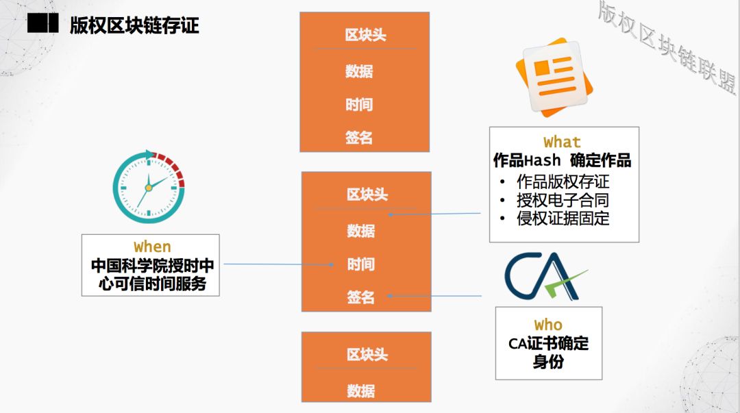 版权区块链应用包括三个方面:第一,确权的存证,证明东西是你的;第二,交易授权,证明我授权给你了,出具授权证明。第三,侵权取证,把授权凭证通过录屏、截屏的方式存储在区块链上。