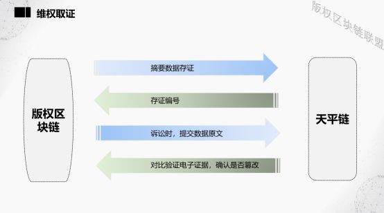 而在维权取证的应用方面,一边是版权区块链,一边是天平链。首先,数据上链的同时,要把相应的数据打包,再计算一个哈希值,存到天平链上,天平链返还相应的编号。在诉讼时,客户就会从我们的平台上提取区块链上原始证据,平台提供一个索引文件,最后把原始证据和索引文件提交到北京互联网法院的诉讼平台上就可以了。