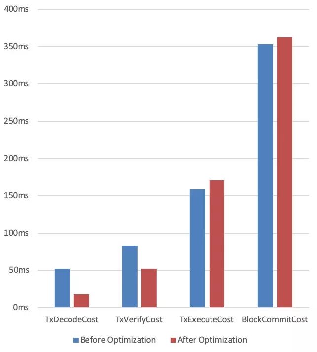 下图展示的是我们在优化交易解码及验签流程时,优化前后性能柱状对比图: