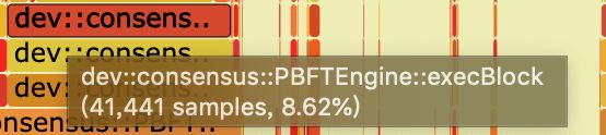 点击某一层时,火焰图会水平放大,该层会占据所有宽度,并显示详细信息,点击左上角的『Reset Zoom』即可还原。下图展示了PBFT模块在执行区块时,各个函数的抽样数占比: