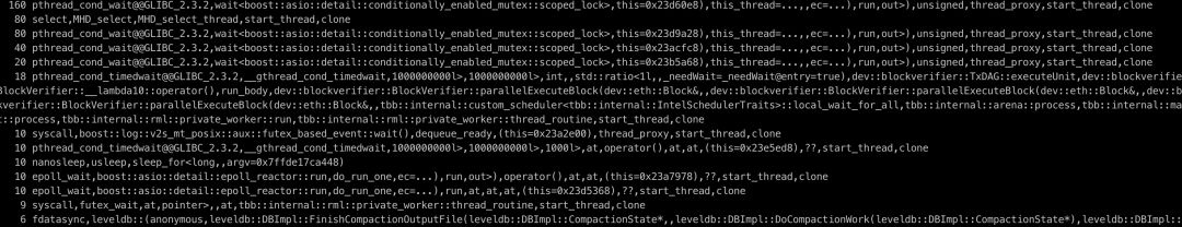 在实现FISCO BCOS的并行执行交易功能时,我们发现有一个令人困惑的现象:有时即使交易量非常大,区块的负载已经打满,但是通过top命令观察到CPU的利用率仍然比较低,通常4核CPU的利用率不足200%。在排除了交易间存在依赖关系的可能后,推测CPU可能陷入了I/O或锁等待中,因此需要确定CPU到底在什么地方等待。