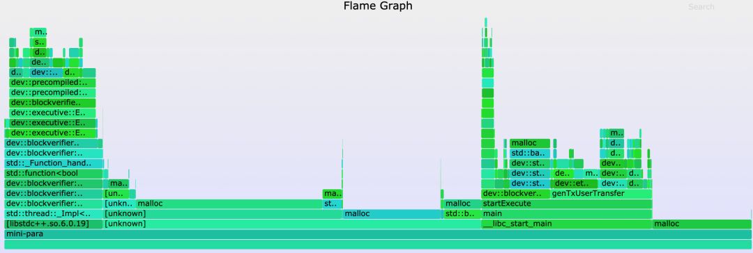 在FISCO BCOS早期测试阶段,我们采取的测试方式是反复执行同一区块,再计算执行一个区块平均耗时,我们发现,第一次执行区块的耗时会远远高于后续执行区块的耗时。从表象上看,这似乎是在第一次执行区块时,程序在某处分配了缓存,然而我们并不知道具体是在何处分配的缓存,因此我们着手研究了内存火焰图。