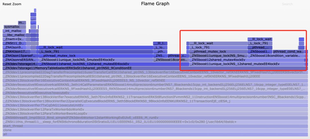 展开执行交易的核心函数后,位于火焰图中右侧的一堆lock_wait很快引起了我们的注意。分析过它们的调用栈后,我们发现这些lock_wait的根源,来自于我们在程序中有大量打印debug日志的行为。