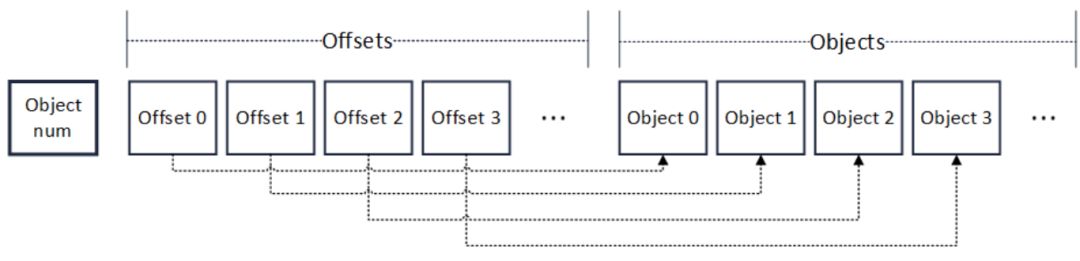 改造过程中,我们在系统中使用的普通RLP编码的基础上,加入了offset字段,用以索引每个Object的位置。如下图所示,改造后编码格式的开头,仍然是对象的个数(Object num),但是在个数字段后,是一个记录对象偏移量的数组(Offsets)。