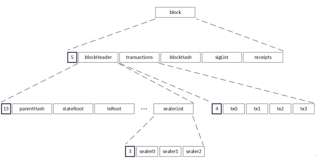 解码时,由于RLP编码中每个对象的长度不确定,且RLP编码只记录了对象的个数,没记录对象的字节长度,若要获取其中的一个编码对象,必须递归解码其前序的所有对象,在解码前序的对象后,才能访问到需要访问的编码对象的字节位置。例如在上图中,若需要访问区块中的第0笔交易,即tx0,必须先将blockHeader解码,而blockHeader的解码,需要再次递归,把parentHash,stateRoot直至sealerList都解码出来。