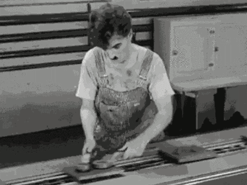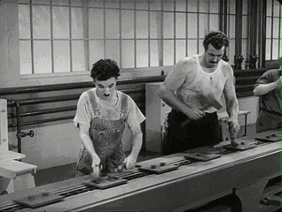 在卓别林的电影《摩登时代》里,卓别林扮演一个工人,日复一日地重复着拧螺丝的动作:提起扳手,找到零件,对准螺丝,拧紧,再提起扳手,再找到下一个零件,再对准螺丝,再拧紧......