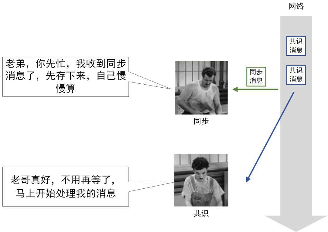 共识模块负责主导整个区块链出块的节奏,应让共识模块先行。而同步模块,理应扮演好配合的角色,辅佐共识模块更快出块。